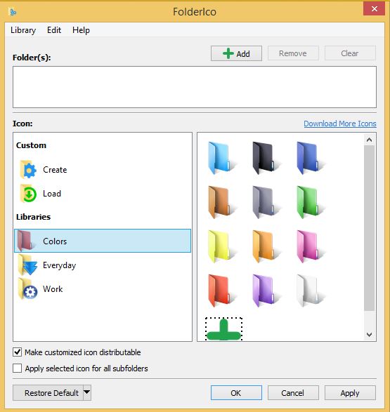 Teorex FolderIco Overview | Teorex FolderIco is an imposing application which will let you customize the appearance of your folders. It offers the context menu integration as well as various different colorful icons. It has been equipped with a clean and user friendly interface that provides very little customization for better handling.The predefined folder icons are spread out on the five tab array and you will be able to find the preferred icons easily. You can easily import their own images or the icon files. Every folder can be customized both by inserting the directory address in the utility or by using Windows shell contextual menu. It has got Menu Editor module that will let the users to create their own icon hierarchy by moving and assigning the different icon colors to different priority. All in all Teorex FolderIco is an imposing application which will let you customize the appearance of your folders. |